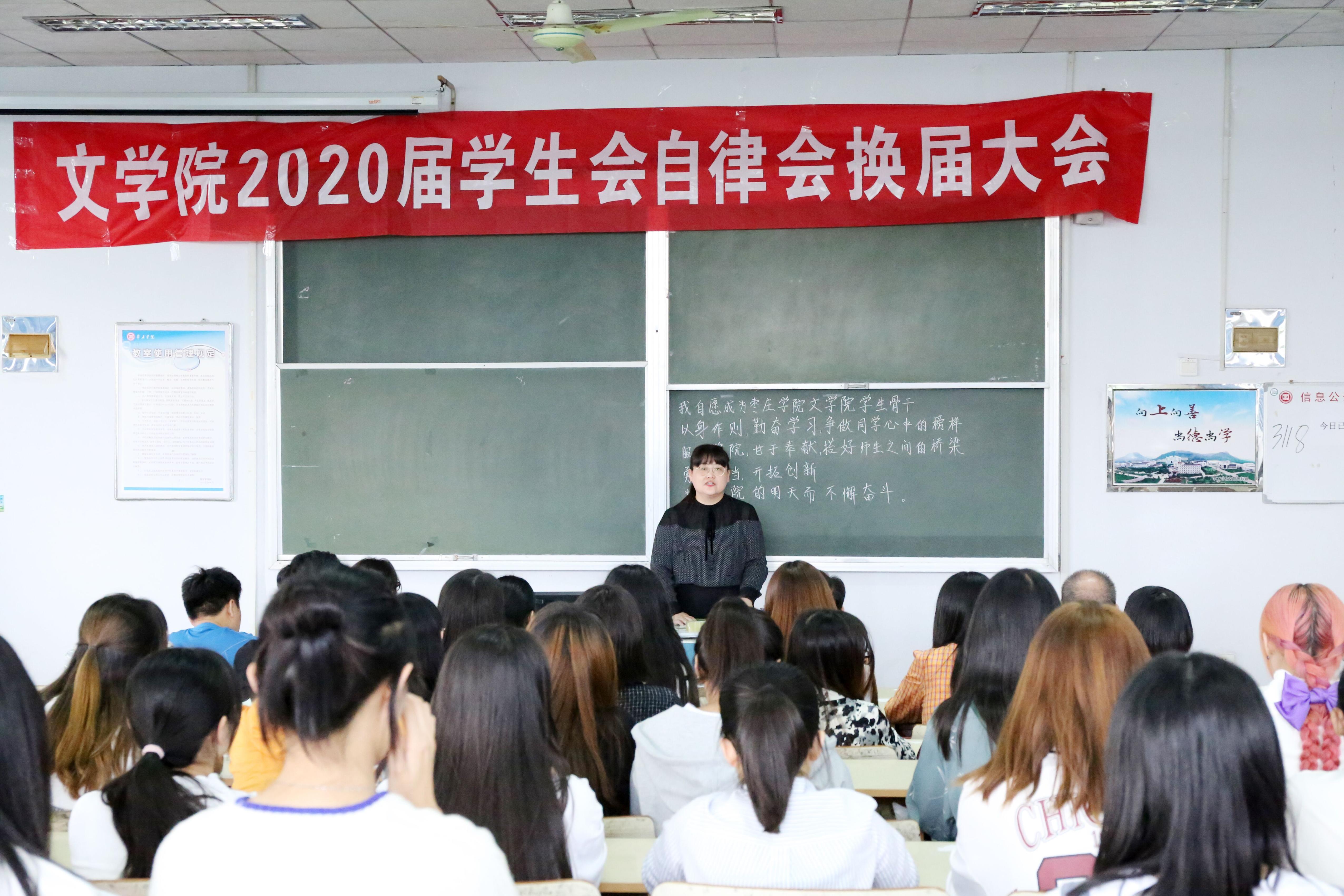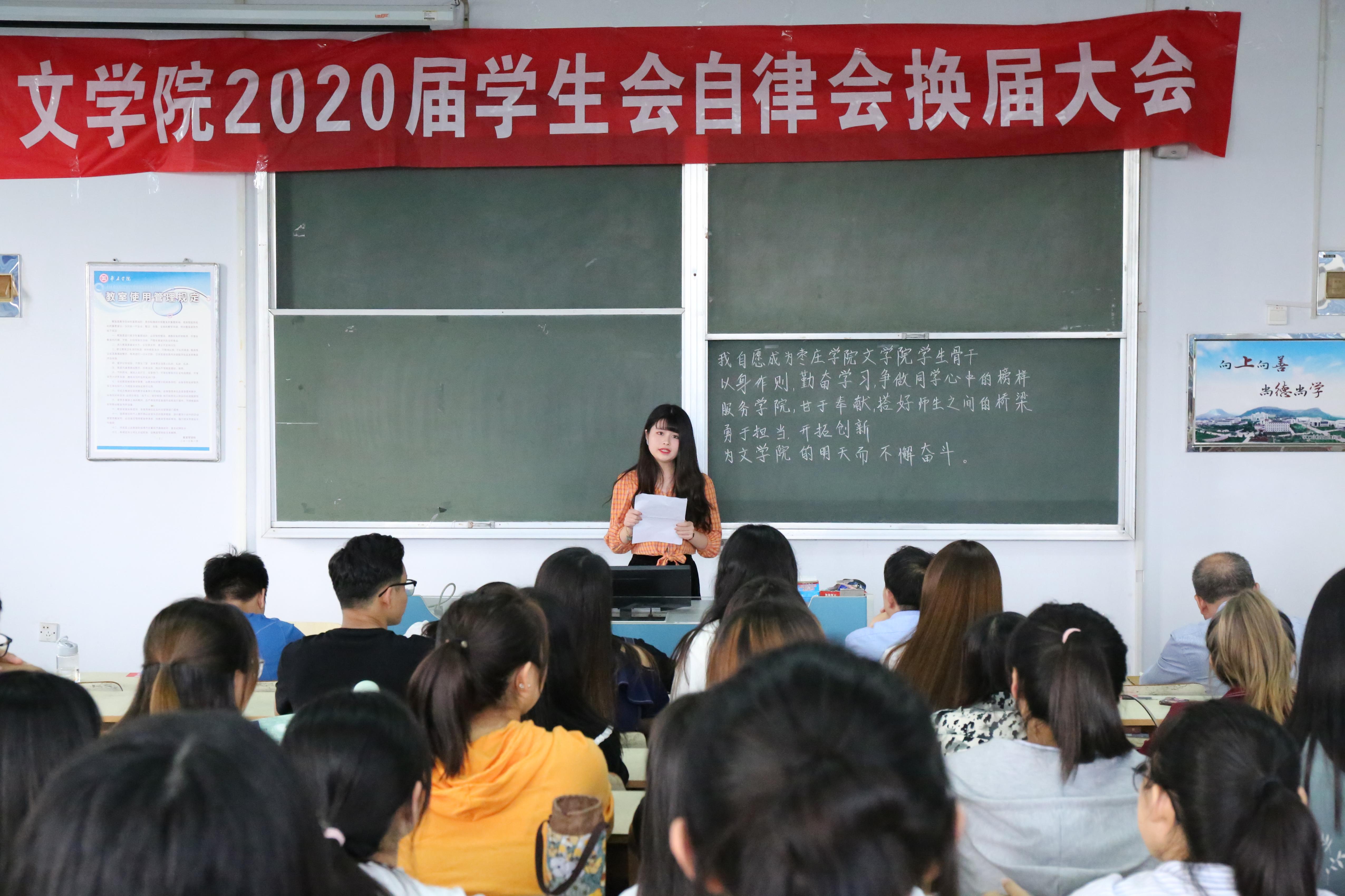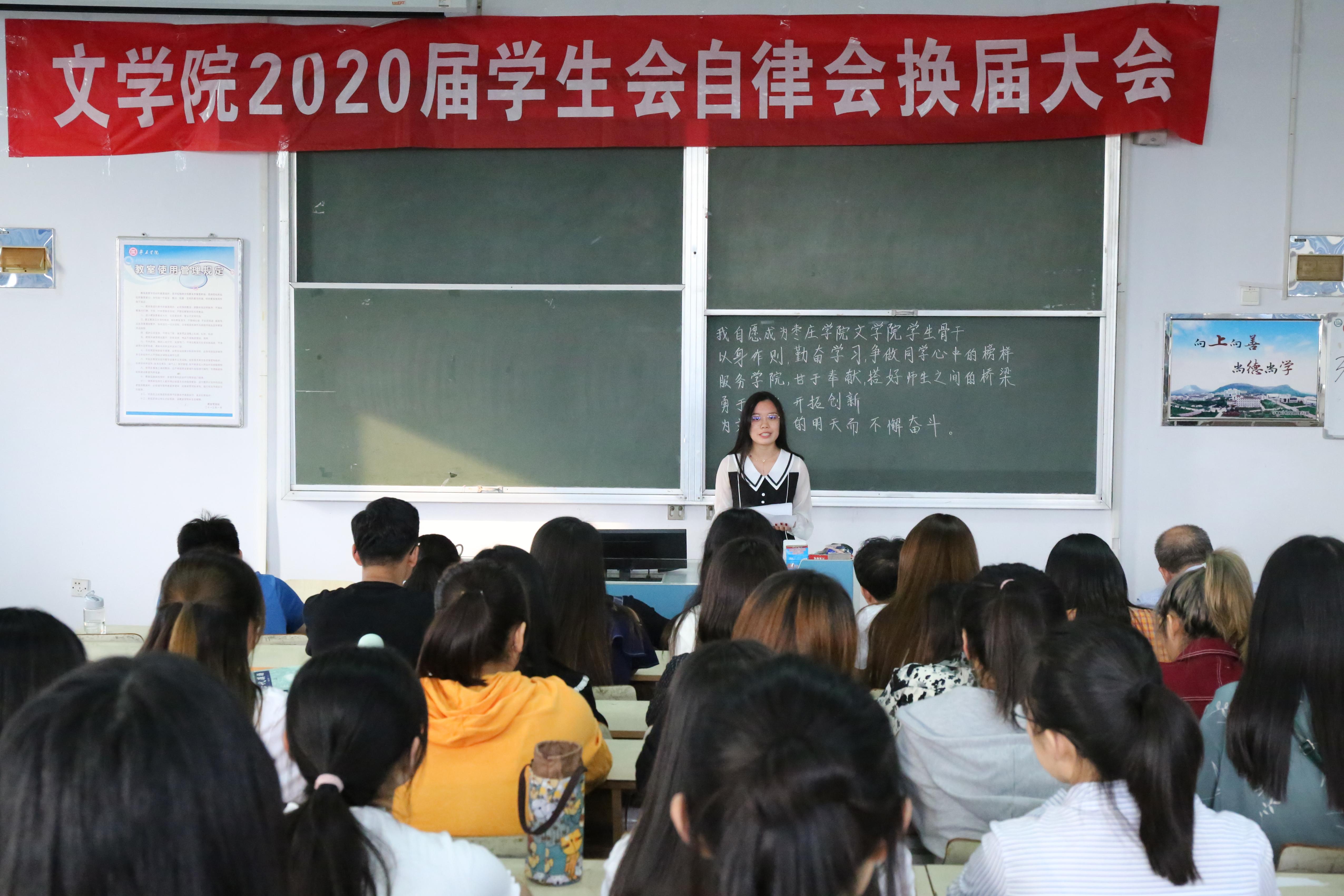 会议第一项由新老学生会、自律会主席进行发言,2019届学生会主席王惠、自律会主席滕晓彤回首了一年来在学生会的收获并对新一届学生会给予了新的期望, 2020届学生会主席李志霄、自律会主席李秀青展望了新一届学生会今后开展的工作。