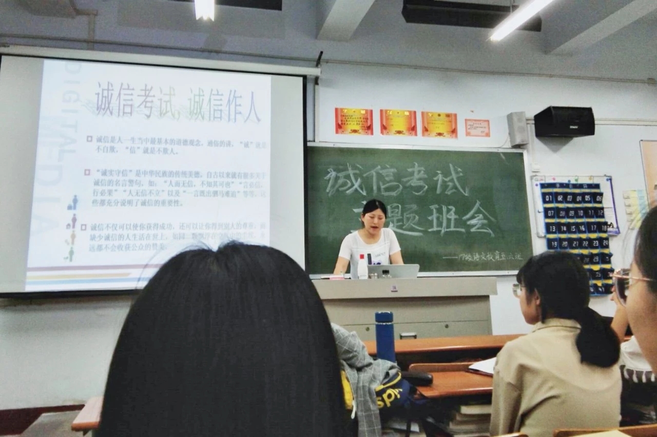各班级辅导员组织同学们开展了关于诚信考试法纪教育主题班会。首先,各班级辅导员为同学们讲解了《国家教育考试违规处理办法》等一系列文件,结合之前的违纪舞弊的案例,从法律的角度对同学们进行了教育。期间,同学们自愿分好小组对诚信考试进行了专题学习和讨论。在班会结束后,各班组织同学们签署诚信考试承诺书,加强了同学们在诚信考试方面的自我约束力。此外,还有部分班级通过QQ群共享了班内的优良学风情况,并采用观看动画视频的方式进行专题教育,加大了考风考纪的宣传力度。在完善制度、注重长效方面,各班构建了学生信用机制和评价体系,从制度上形成约束机制,培养了同学们崇高的诚信品质。
