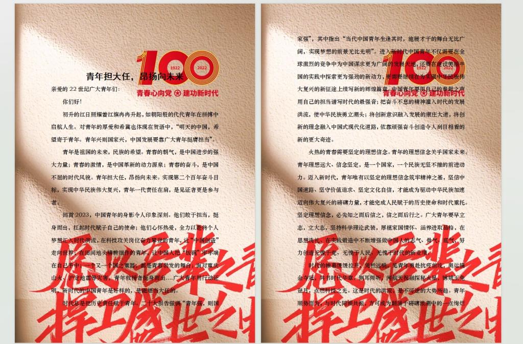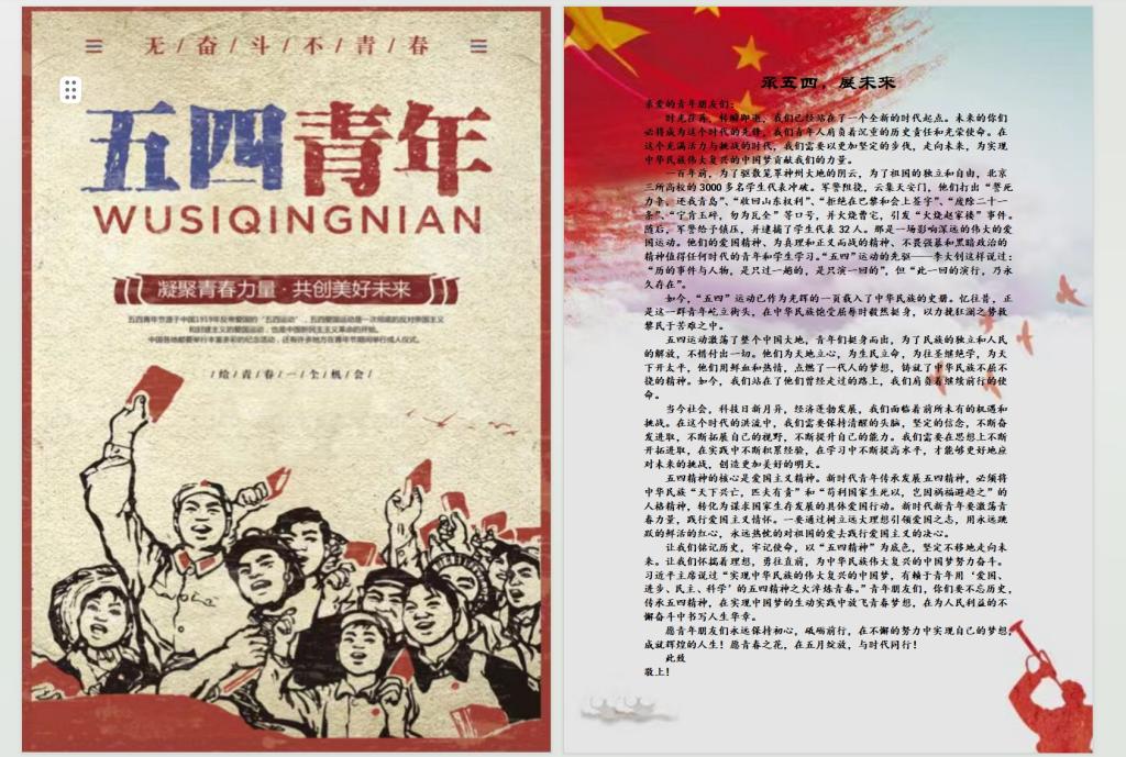 4月30日-5月7日,开展“五四青春,对话未来”青年寄语时空传信活动。活动通过时空传信的形式,将五四精神融入青年个人成长,营造了积极向上的校园文化氛围,有利于激励广大青年勇担时代使命、把握历史机遇,在实现中华民族伟大复兴中国梦的新征程上奋勇前进。