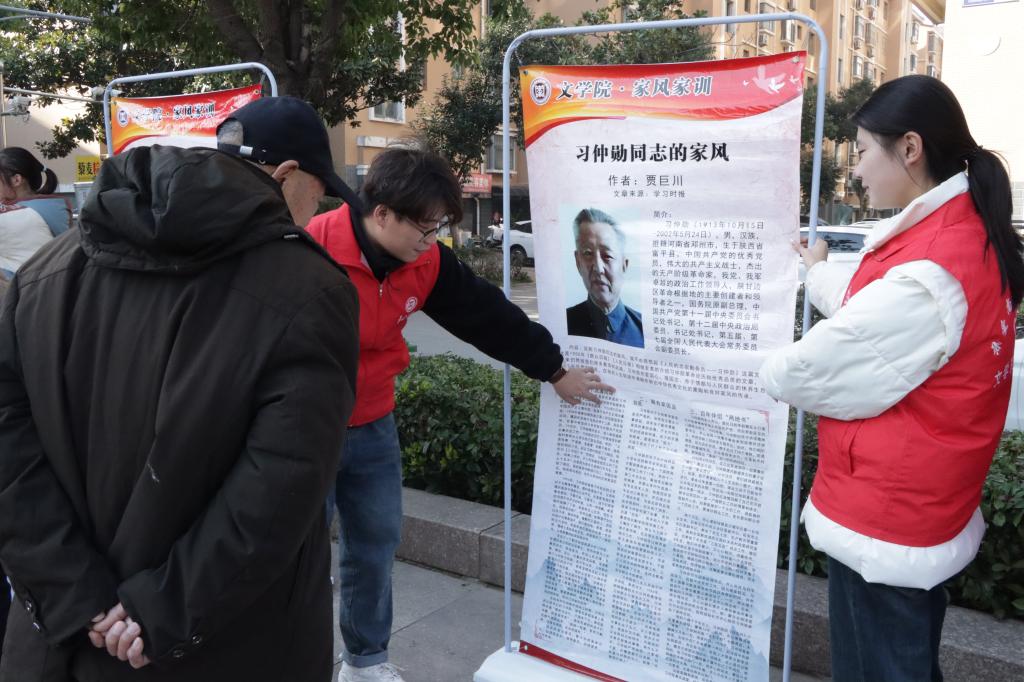 宣讲团成员统一身着红色马甲,分别赴兴仁街道、西界沟村、龙潭实验学校和铁道游击队纪念广场等地,在行人密集处摆放提前制作的家风家训易拉宝,采取“集中讲解+分散宣传”的方式,讲解老一辈革命家毛泽东、朱德等人和古代十大名人的家风家训,用通俗易懂的语言介绍司马光教子有方、吉鸿昌不忘父训等践行良好家风的典型案例,还通过分享生动的案例和自我成长故事,让居民感受到良好的家风家训在家庭建设中的重要作用。