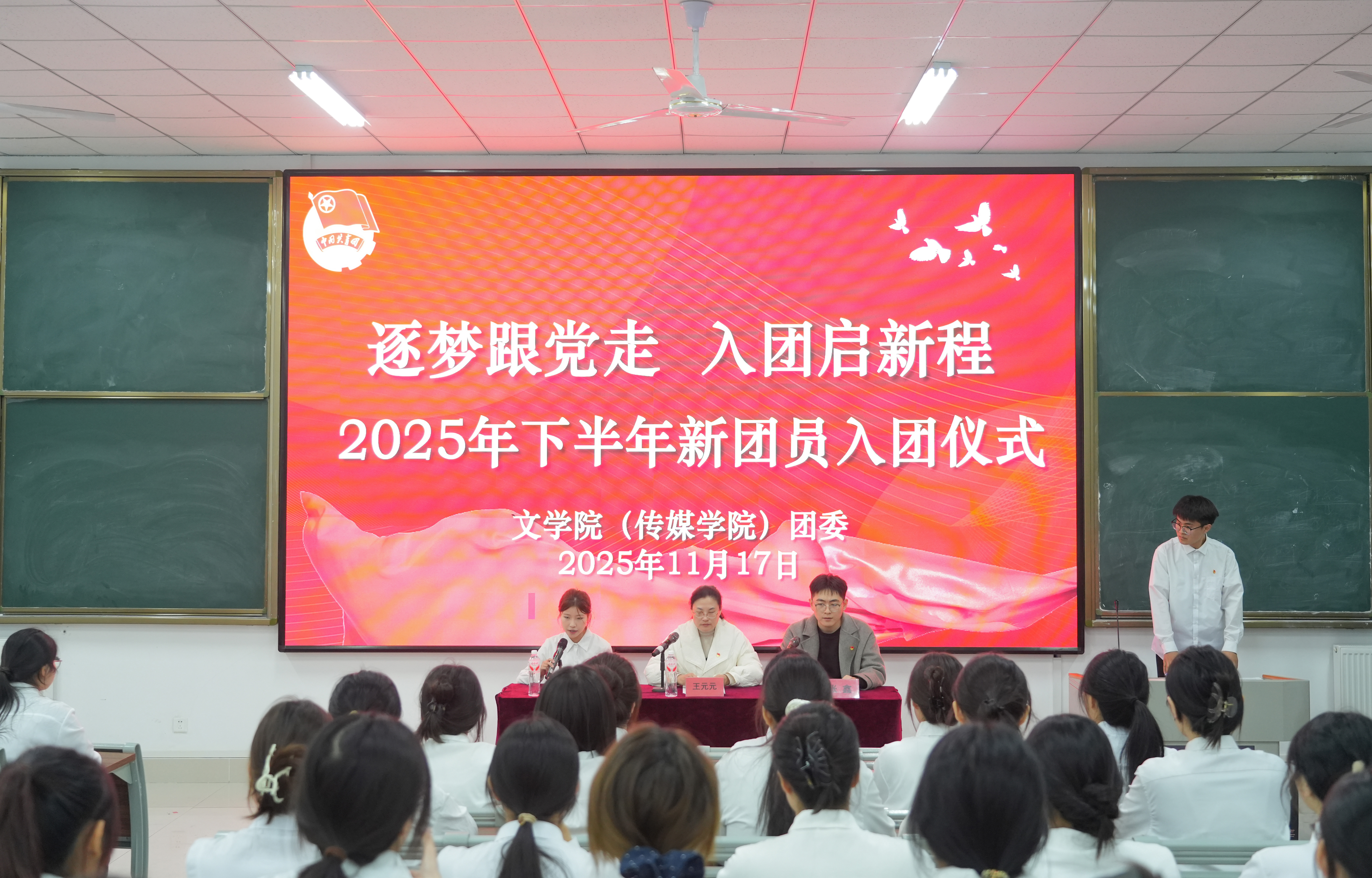 11月17日晚,bevitor伟德国际1946(传媒学院)在崇德楼208教室举行2025年下半年新团员入团仪式。仪式在庄严的国歌声中拉开帷幕,学院团委书记王元元、辅导员张鑫等出席活动。