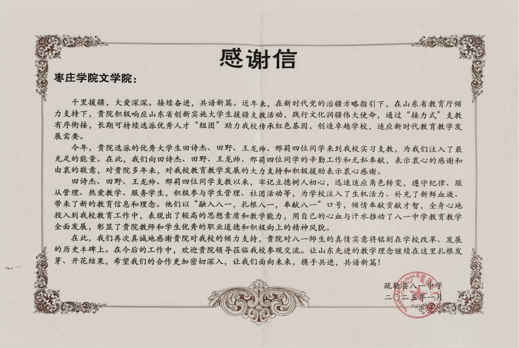 疏勒县八一中学向我院发来感谢信