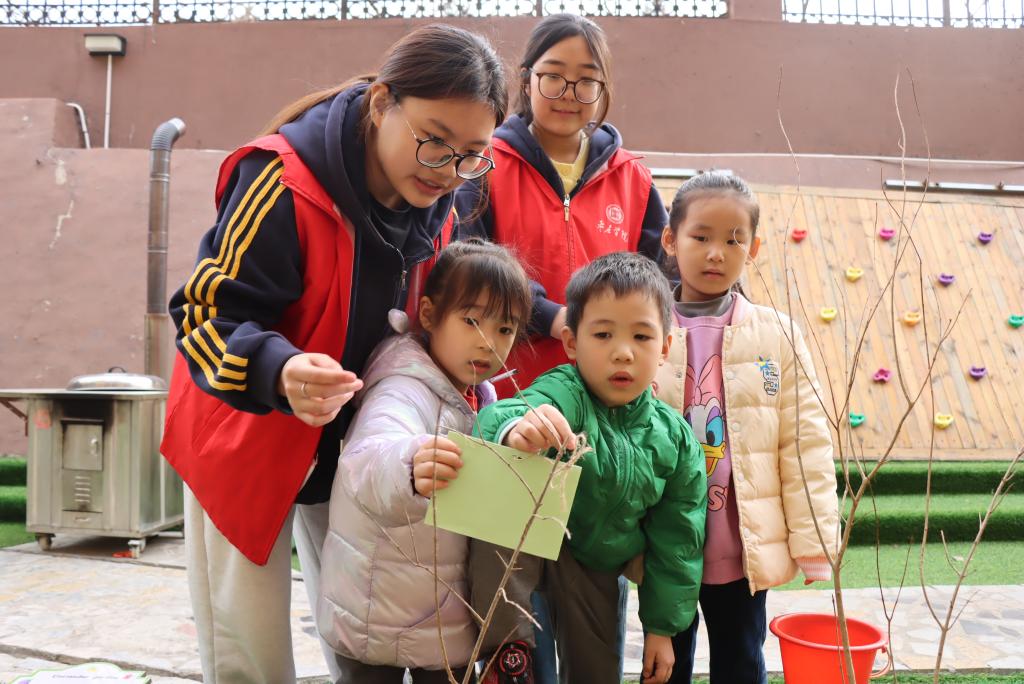 春日暖阳,风与光都温柔地洒在校园。在植树现场,身穿红马甲的志愿者“大朋友”们与活泼可爱的小朋友们,一起培土、浇水,共同栽下一棵棵爱心树。在同学们的帮助下,孩子们把一片片写有“爱心树”“友谊林”“绿宝贝”心愿卡系在树枝上。崭新的树苗轻轻摇曳,沾着泥点的小脸上绽放着童真。在教室里,同学们通过精心准备的PPT,向小朋友们讲解植树节的由来,讲述树木森林创造宜居生态环境的重要意义,分享人与自然和谐生共处的故事。小朋友们认真聆听,踊跃发言,欢声笑语不断。