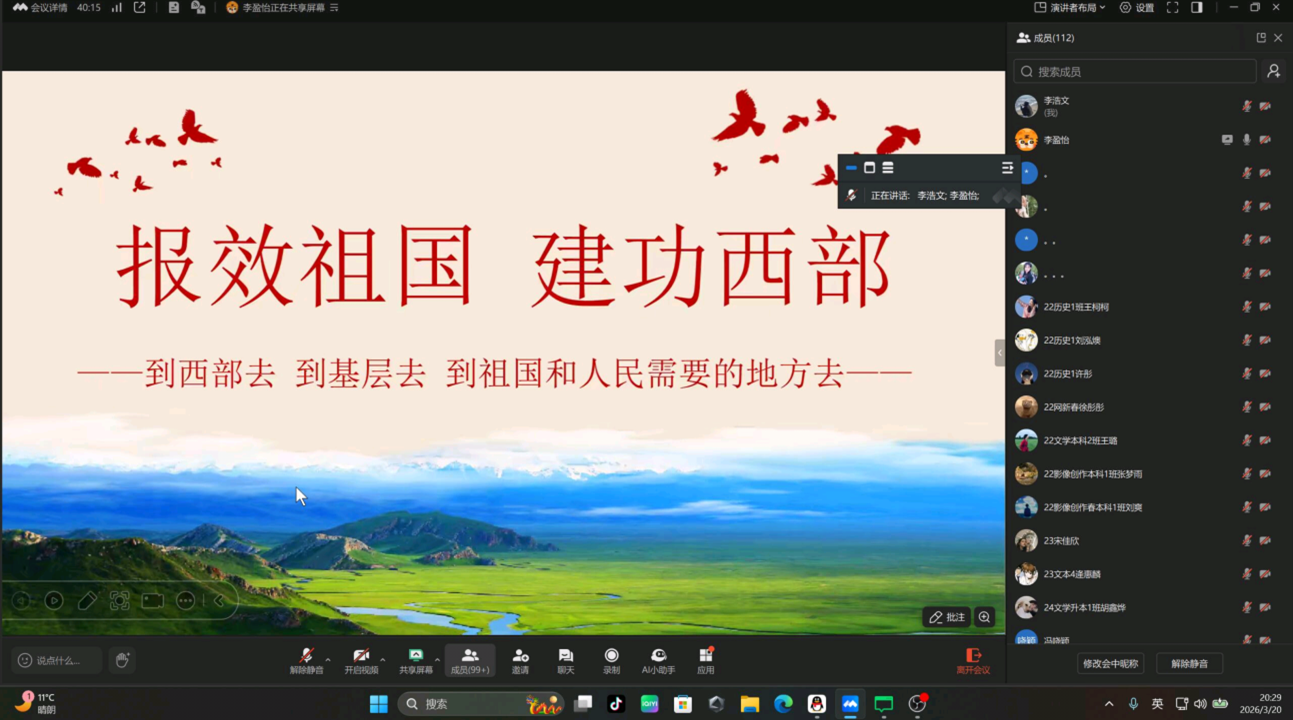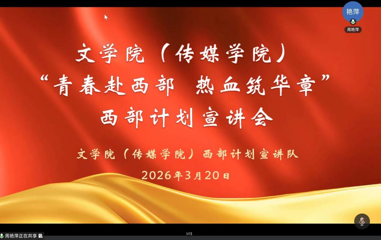 为积极响应国家西部建设号召,推动2026年西部计划招募工作有序开展,3月20日,bevitor伟德国际1946(传媒学院)举办“青春赴西部 热血筑华章”西部计划线上宣讲会,学院100余名师生参加。